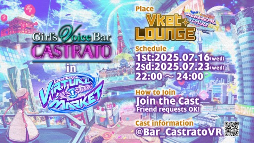 Girl's voice barカストラートは 両声類&両声類を目指しているキャストが接客してくれる バースタイルの店舗型イベントです。 難しいドレスコードなどは特になく、どなた様もjoinのみで参加することができます。 お酒を飲んだり、みんなとお話したりして楽しい時間をお過ごしください。 Vket 2025 summer中の7/16(水)、7/23(水)は、 会場のひとつ「パラリアル東京」にあるVketラウンジにて営業。 いつもとちょっと違った雰囲気でお楽しみいただけます。 初めてのかたも、そうじゃない方も、お気軽にお越し下さい。 【参加方法】 Group+でオープンいたします。 グループの参加ではなく、 各インスタンスのキャストor来店中のフレンドへJoinしてください。 もしも「フレンドがいないよ!」という方は、 気になるキャストにフレンド申請を送って、Joinしてきてくださいね。 当日の出勤キャストの情報は、当日の20時ごろから公式Xにて発表します。 告知ポスト:https://x.com/Bar_CastratoVR/status/1944734907877712022 Xアカウント:https://x.com/Bar_CastratoVR #カストラート_VRC