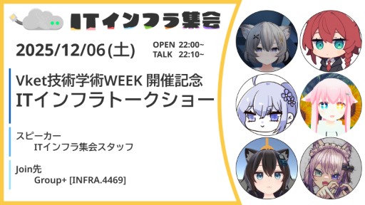 今回はVketとのコラボ回になります! 22:10から「ITインフラ集会スタッフ」による「ITインフラトークショー」があります。 是非気軽にご参加ください!