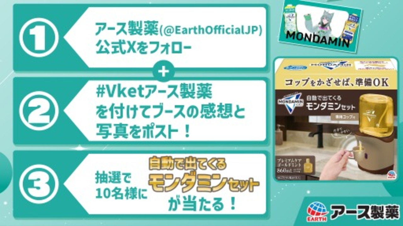 1️⃣アース製薬(@EarthOfficialJP)公式Xをフォロー 2️⃣#Vketアース製薬を付けてブースの感想と写真をポスト! 3️⃣抽選で10名様に自動で出てくるモンタミンセット10名様にが当たる!