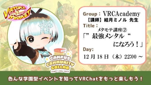 一人ひとりの挑戦と成長を支える学びと交流の学園型イベント『VRCAcademy』! 皆さんの “新たな一歩” を踏み出す舞台として、様々なイベントを企画・開催しています。 学園系コミュニティーコラボイベント出張講義!! 講師、結月ミノル先生による『メタモテ講座② 「”最強メンタル“になろう!」』をご講演頂きます! 実践をより重視したメンタルトレーニングを行います!VRChatでもリアルでも、活用できる内容となっています! 是非、気軽に参加してね! JOIN方法:Vket公式グループからJOIN! 詳細はこちらへ! https://x.com/VRC_Academy/status/1996882250655514815?s=20
