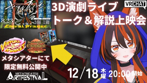 今年開催した3Dワンマンライブ『#鏡奏祓歌_キラルプレイヤー 』第一部演劇パートを限定無料公開! それにあたってトーク&解説つきイベントを実施します。 📍『架空植物園エクソプラント -秋- 創造の萌芽』 🎪一般社団法人メタシアター 🔗Group:iro〆mono project (http://vrc.group/IRTMN.7954) 参加方法 Groupパブリックでインスタンスを開きますので、「警戒ちゃん」やフレンドにリクインしてください。 🎫 公演概要 公演日:2025年8月23日(土)13:00〜 形式:音楽演劇ライブ(オンライン+会場) ネットチケット(配信視聴):6,500円 ※アーカイブ販売中!(~2026年8月23日) 配信URL:https://zan-live.com/ja/live/detail/10604 3Dワンマンライブ『#鏡奏祓歌_キラルプレイヤー 』とは- 警戒ブロオドキャストCHERRY活動10周年記念3Dワンマンライブ モーションキャプチャースタジオで1人劇音楽ライブをします! 第一部では演劇のようなストーリーライブ 第二部では楽しく盛り上がるライブに分けてメリハリのある音楽ライブにします。 警戒ちゃんの10周年の区切りと覚悟を見届けてください。 🔻campfire https://camp-fire.jp/projects/844282/view?utm_source=twitter&utm_medium=social&utm_campaign=tw_share_c_msg_projects_show