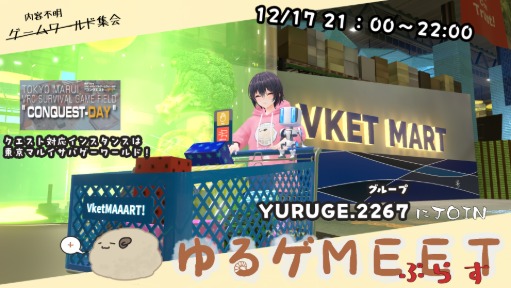 「みんなであそぶをはじめよう!」ゆるゲMEETは毎週水曜夜21時開催のゲームワールド集会です。VRChatを始めたばかりの方も普段ゲームワールドで遊ばない方も大丈夫!スタッフが優しく遊び方を教えます。 今回は特別回!「ぶいけっとまーと! - フレッシュ」でお買い物バトル!指定された金額に一番近くお買い物できるのは誰か競います。 また、クエスト対応インスタンスは「東京マルイVRCサバゲーワールド」で遊びます! 12/17(水)20:50に集会場を開くので、グループID:YURUGE.2267で検索して参加してください!ぜひ来てね~