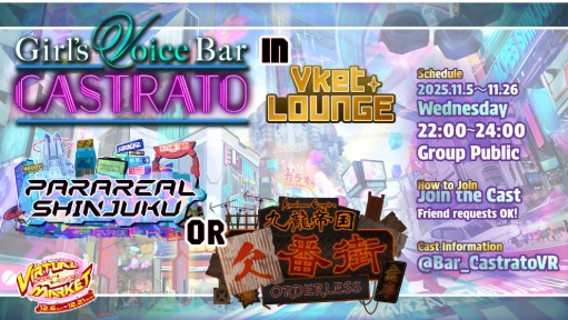 Girl's voice barカストラートは 両声類&両声類を目指しているキャストが接客してくれる バースタイルの店舗型イベントです。 難しいドレスコードなどは特になく、どなた様もjoinのみで参加することができます。 お酒を飲んだり、みんなとお話したりして楽しい時間をお過ごしください。 Vket 2025 Winter中は、 毎週ワールドを変えながら営業。 Vketラウンジで、いつもとちょっと違った雰囲気でお楽しみいただけます。 初めてのかたも、そうじゃない方も、お気軽にお越し下さい。 【参加方法】 Group+でオープンいたします。 グループの参加ではなく、 各インスタンスのキャストor来店中のフレンドへJoinしてください。 もしも「フレンドがいないよ!」という方は、 気になるキャストにフレンド申請を送って、Joinしてきてくださいね。 当日の出勤キャストの情報や開催インスタンスは、 当日の20時ごろから公式Xにて発表します。 Xアカウント:https://x.com/Bar_CastratoVR #カストラート_VRC
