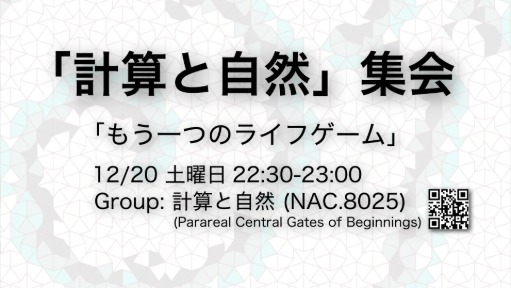 「自然計算」という自然と計算のかかわりを扱う研究分野の話題についてあれこれ話し合うことを目的とした集会です。 日時: 12/20(土) 22:30-23:00 開催グループ: https://vrc.group/NAC.8025 タイトル 「もう一つのライフゲーム」 自然計算マニアのnconcが、AR/VRデバイスによるバーチャルな空間における、非同期かつ非決定性なリアル「ライフゲーム」について話題提供をする予定です。